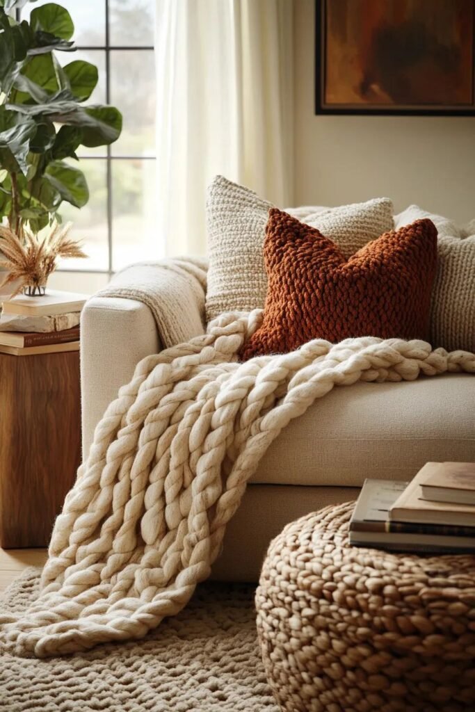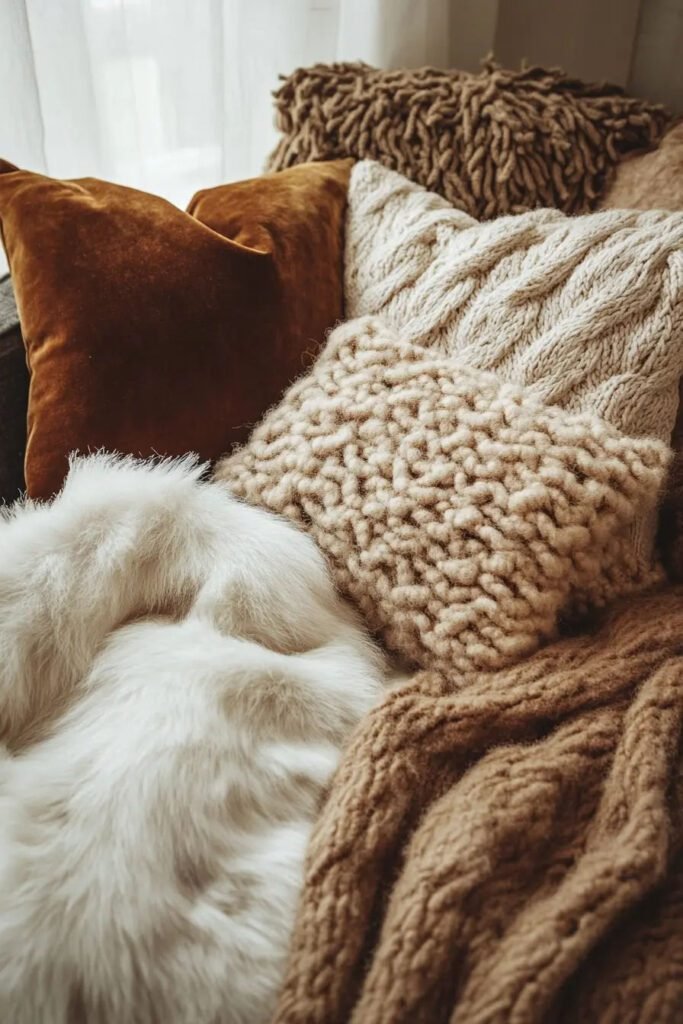 - Seasonal Textiles: Rotate cushion covers and throws in velvet, boucle, or cashmere blends.