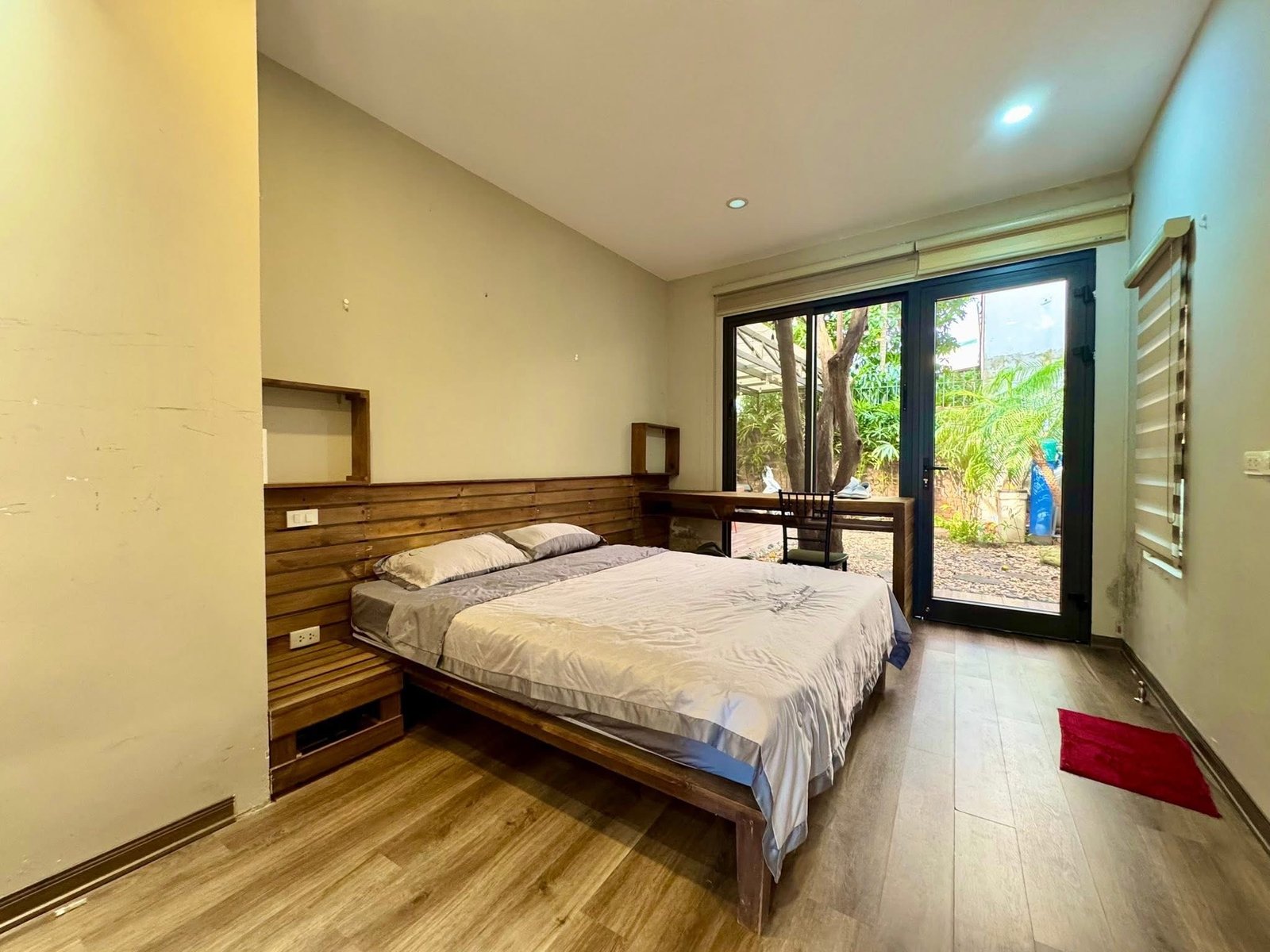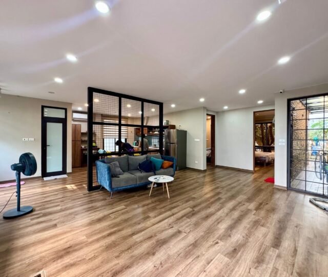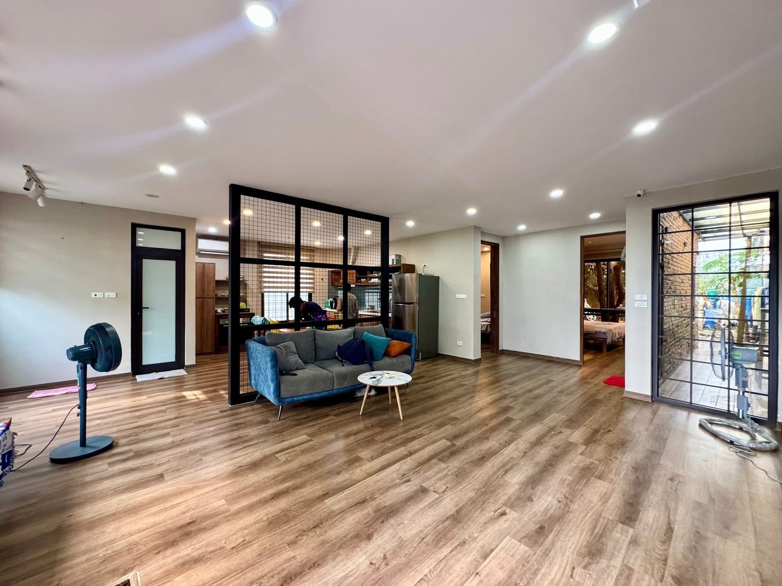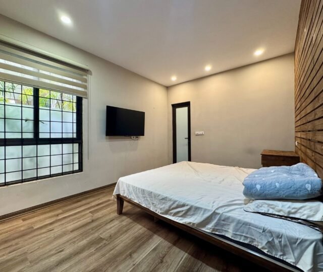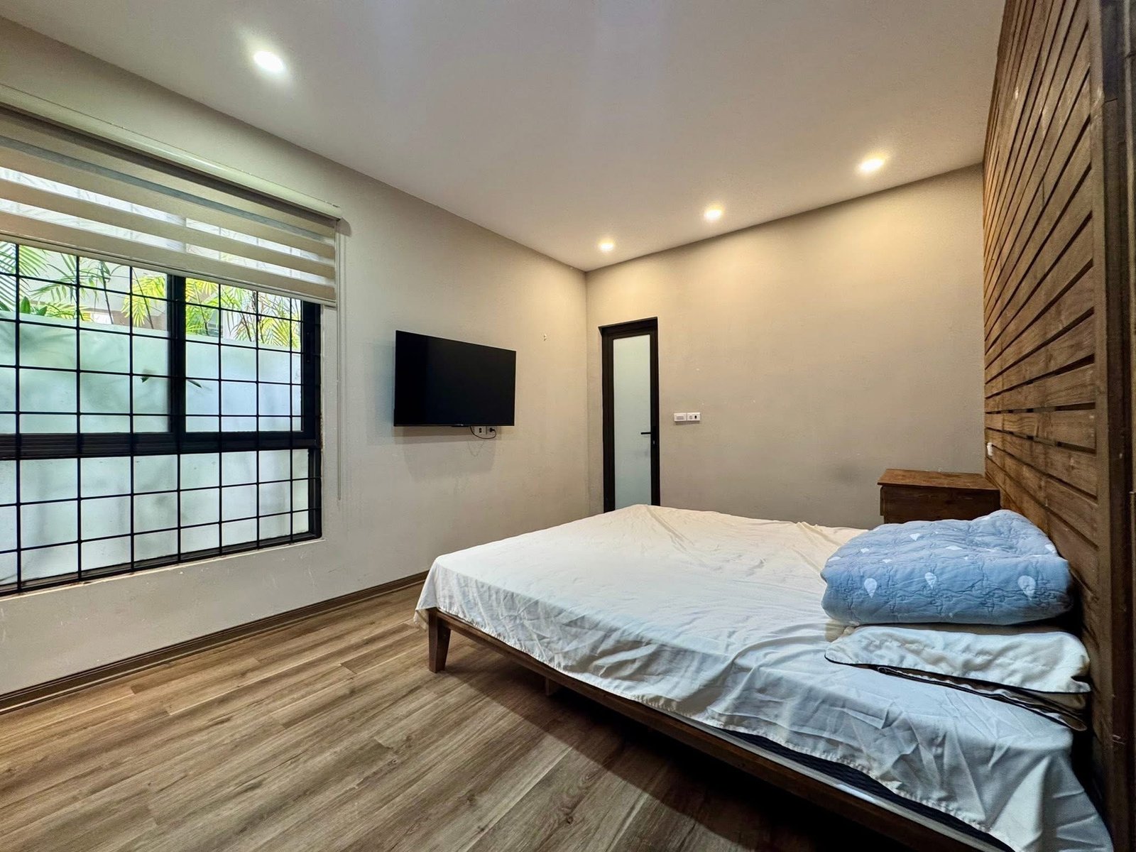 Charming 2-bedroom, 2-bathroom lake view house for rent in West Lake, Hanoi. Single-floor design with spacious living room, modern kitchen, 50m² garden, car access, and full furniture. Perfect for couples seeking quiet and convenience near gyms, supermarkets, and daily services.