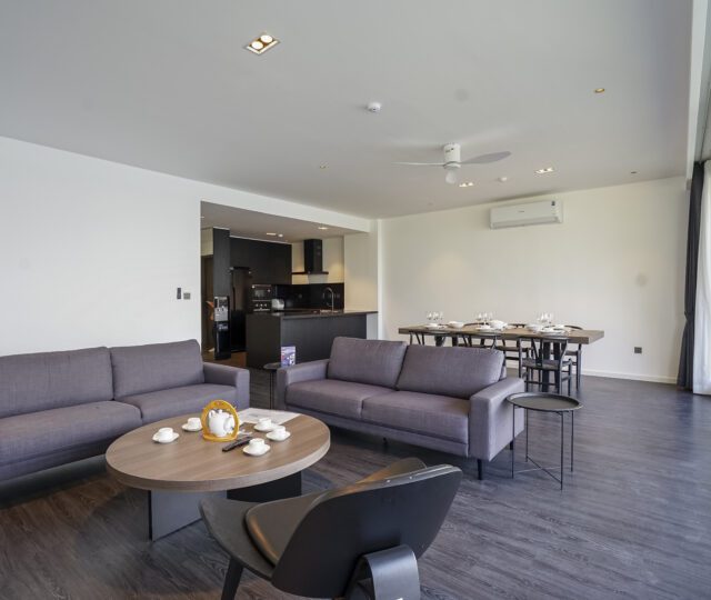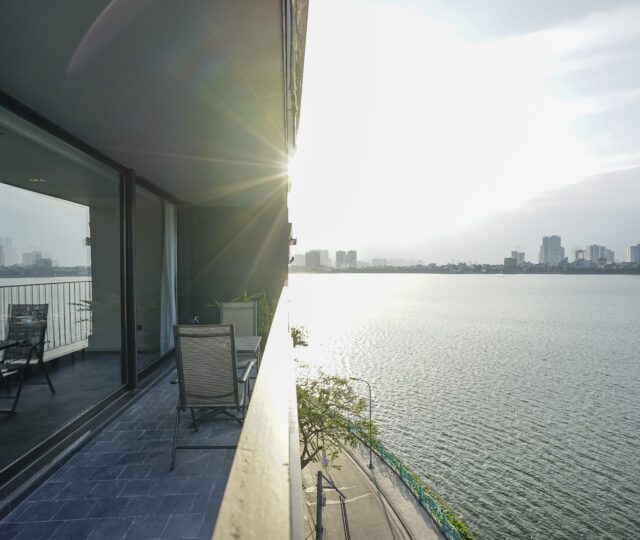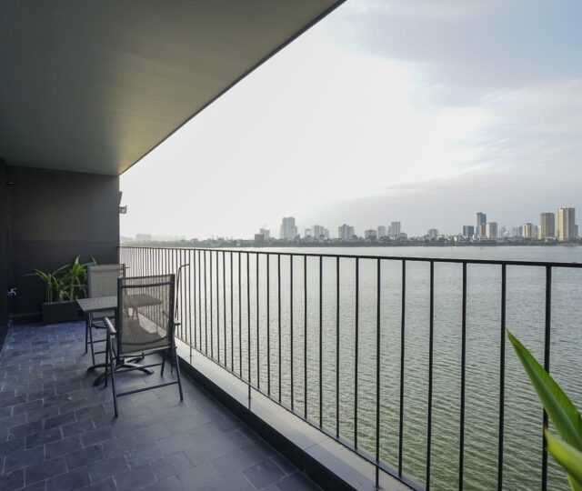 Stylish 3-bedroom apartment on the 5th floor with panoramic West Lake views, located on Quang Khanh Street, Tay Ho. Fully furnished with 3 bathrooms, 2 balconies, modern design, and full services: internet, water, cable TV, cleaning 3 times/week, 24/7 security, and basement parking.