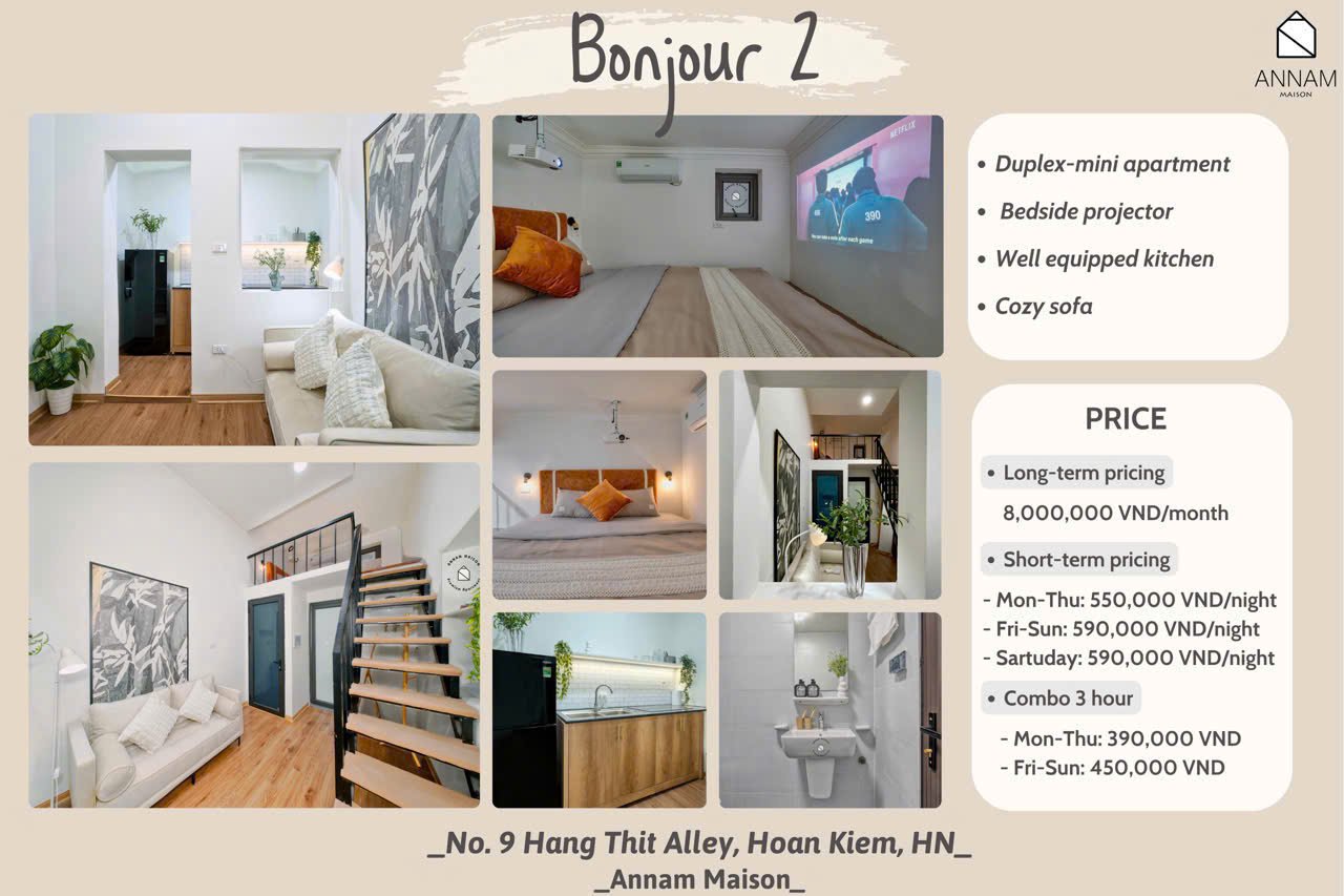 Charming Duplex apartment for rent in Hoan Kiem, Hanoi, available for both short-term and long-term stays. Fully furnished with modern amenities in a prime location.