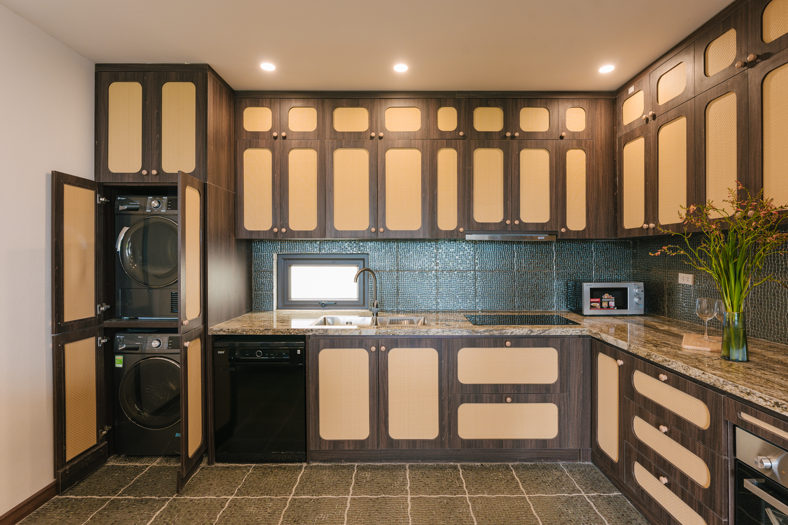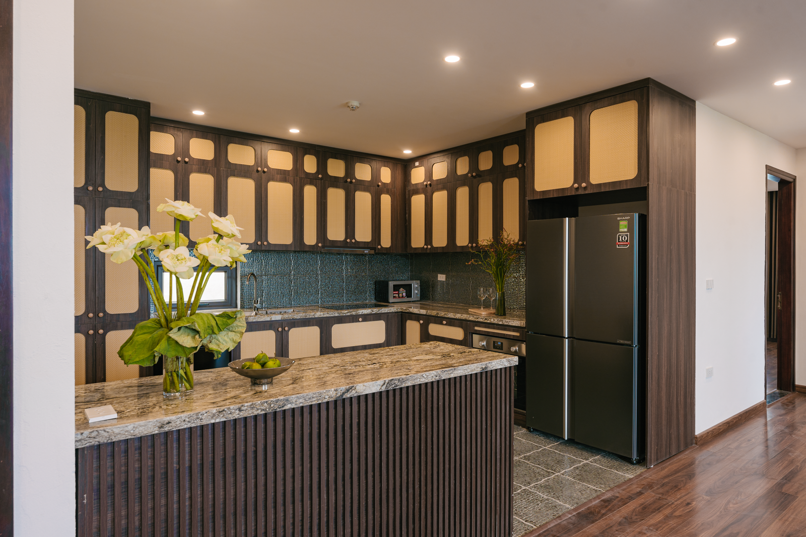 Fully equipped open kitchen with island counter