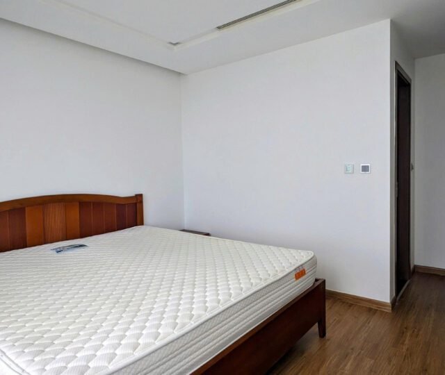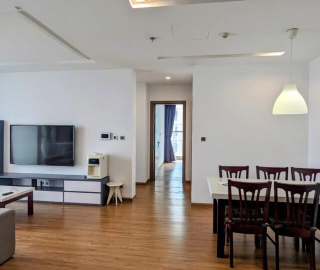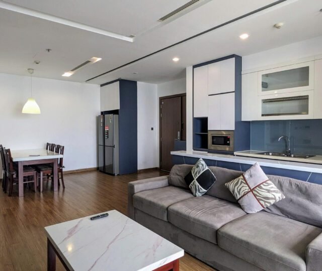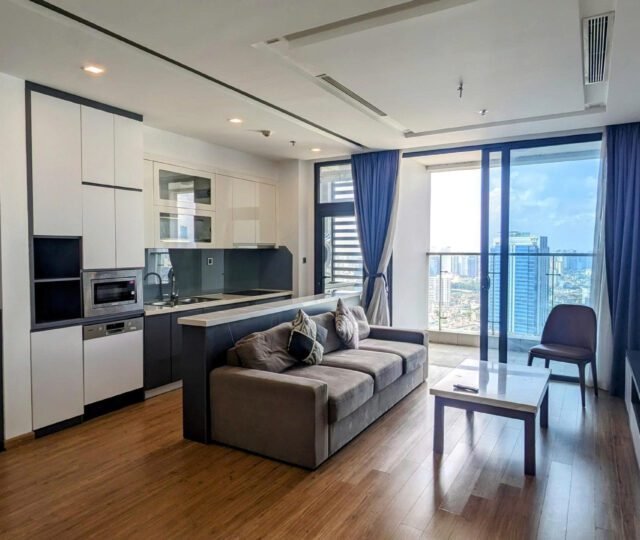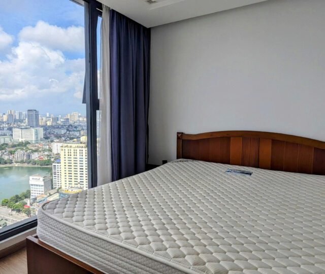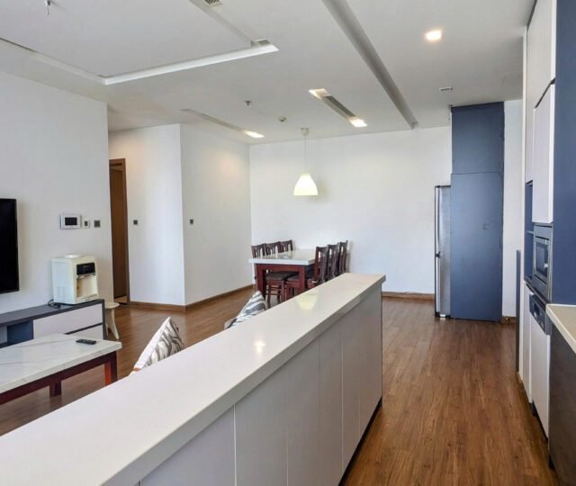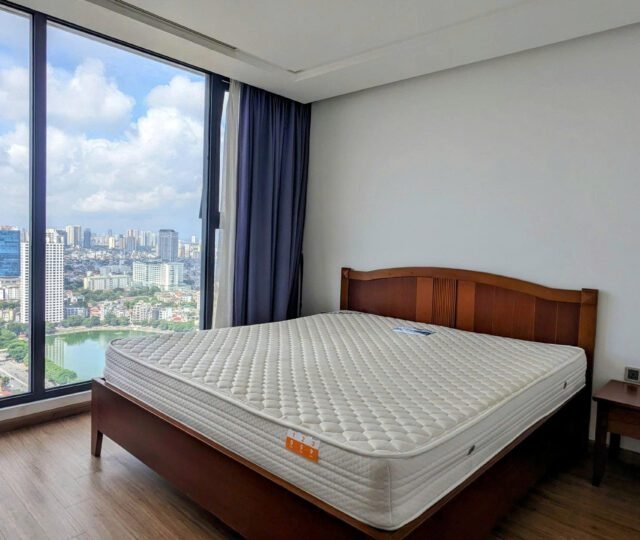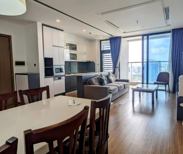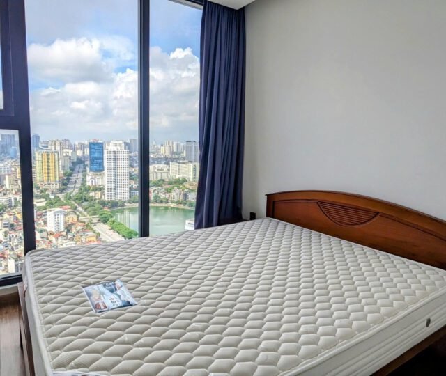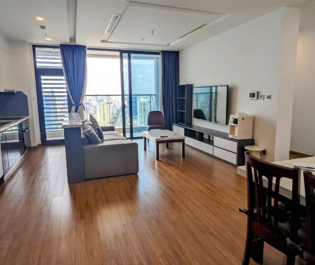 High-floor 2 bedroom apartment for rent in Vinhomes Metropolis, Lieu Giai. This bright, modern unit features stunning city views, a fully equipped kitchen, two bathrooms, central A/C, and access to top-tier amenities including a swimming pool, fitness center, shopping mall, and 24/7 security—perfect for upscale city living.