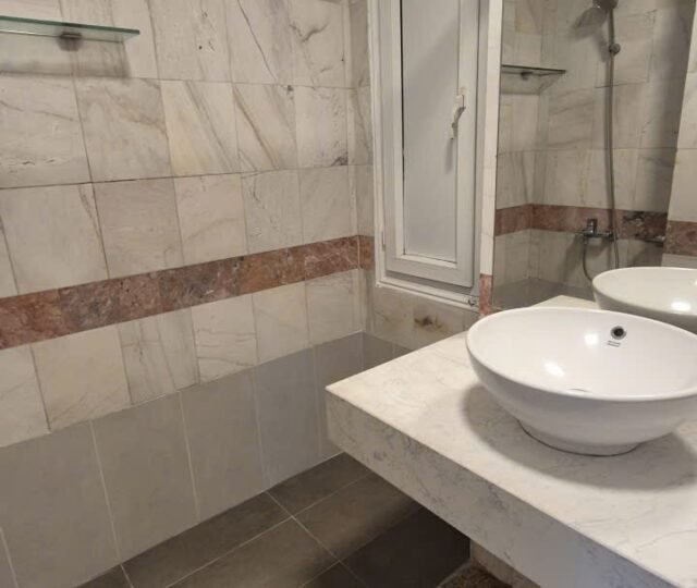 The apartment spans 130 m², featuring two spacious bedrooms, two bathrooms, a bright open-plan living room, and a fully equipped kitchen. Large windows fill the space with sunlight, creating a calm and inviting atmosphere ideal for both families and professionals.