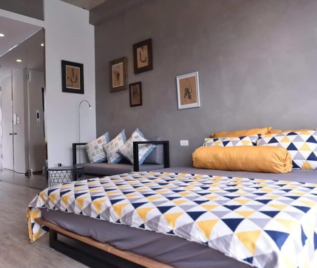 The apartment includes a cozy bedroom, modern bathroom, and a well-equipped kitchen, with large windows that bring in plenty of natural light. The interior is simple yet thoughtfully designed, creating a warm and welcoming atmosphere.