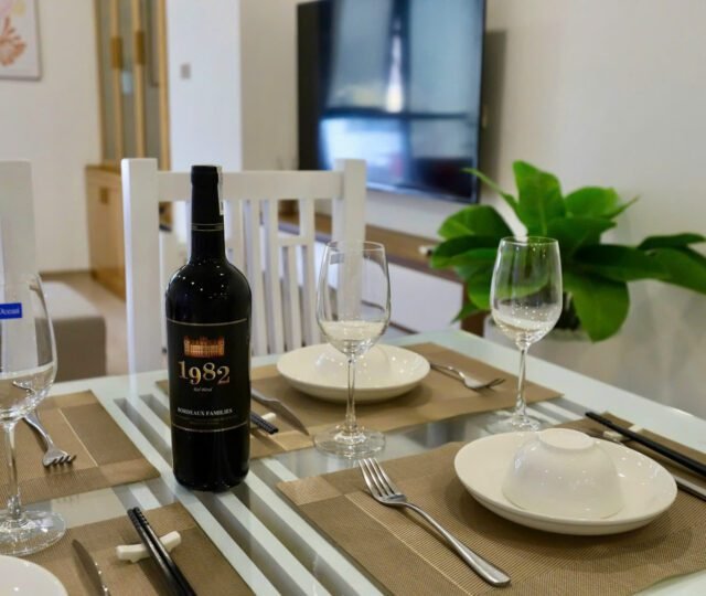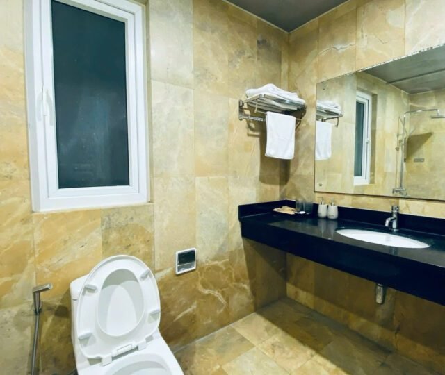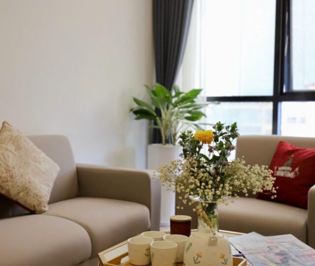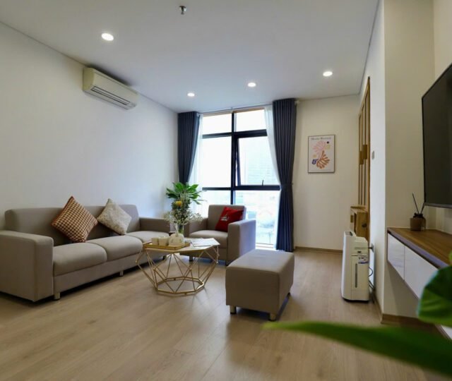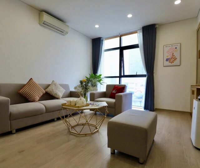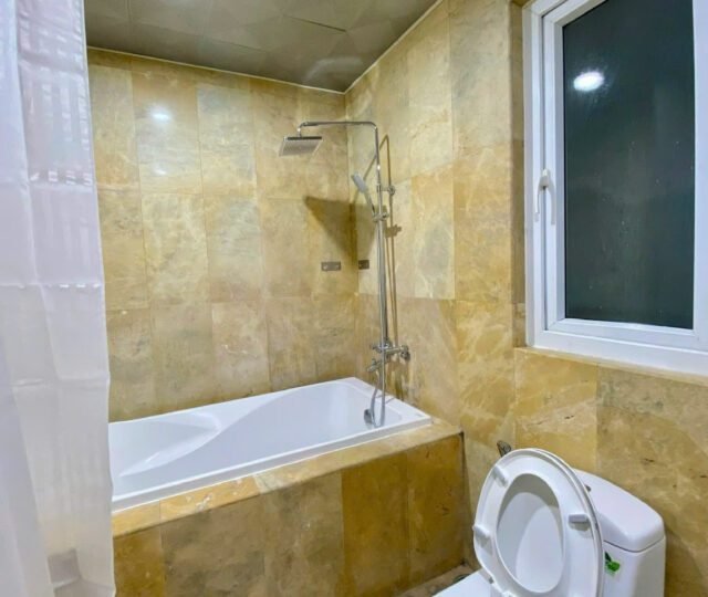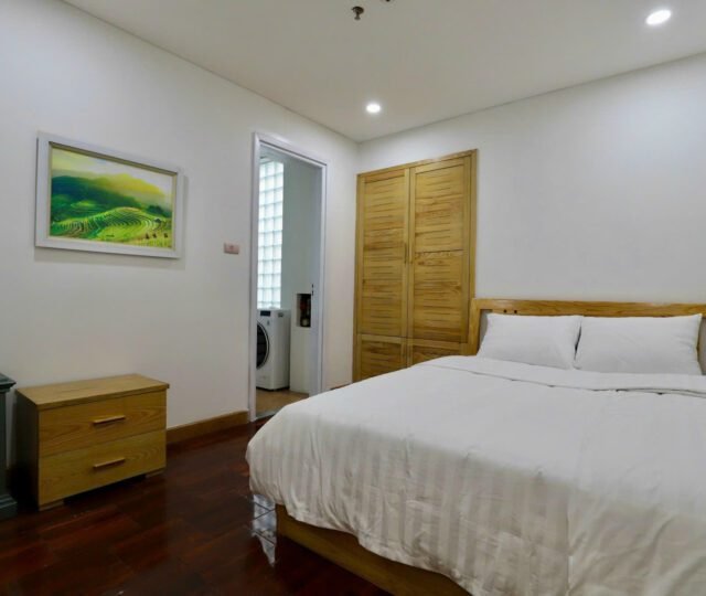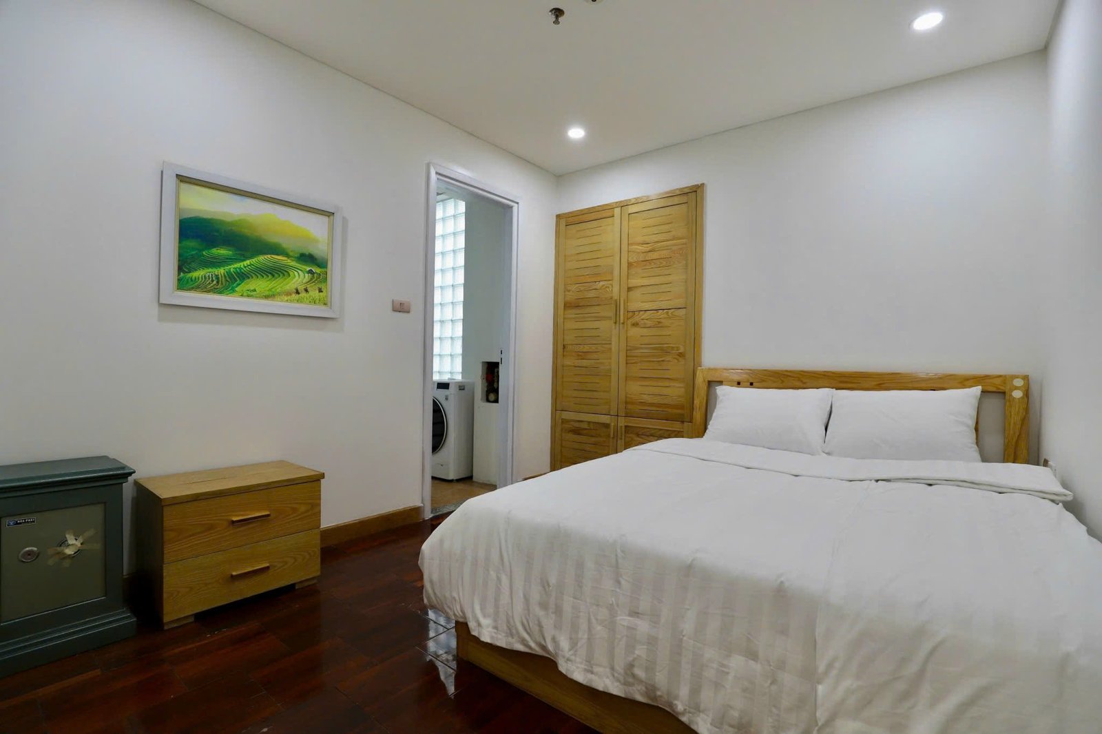 This 80m² 2-bedroom apartment offers a comfortable master suite, bathtub, and modern furnishings. Units available now on floors 301, 501, and 601 in a secure building at 32 Kim Ma Thuong.