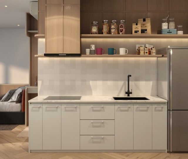 Air-conditioning, TV, fridge, and basic kitchen setup