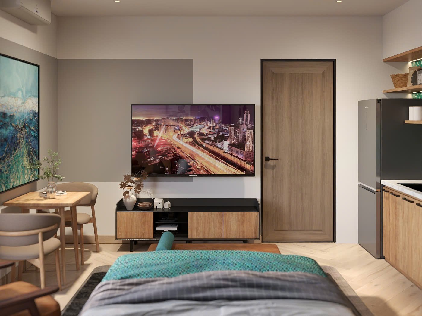 Air-conditioning, TV, fridge, and basic kitchen setup