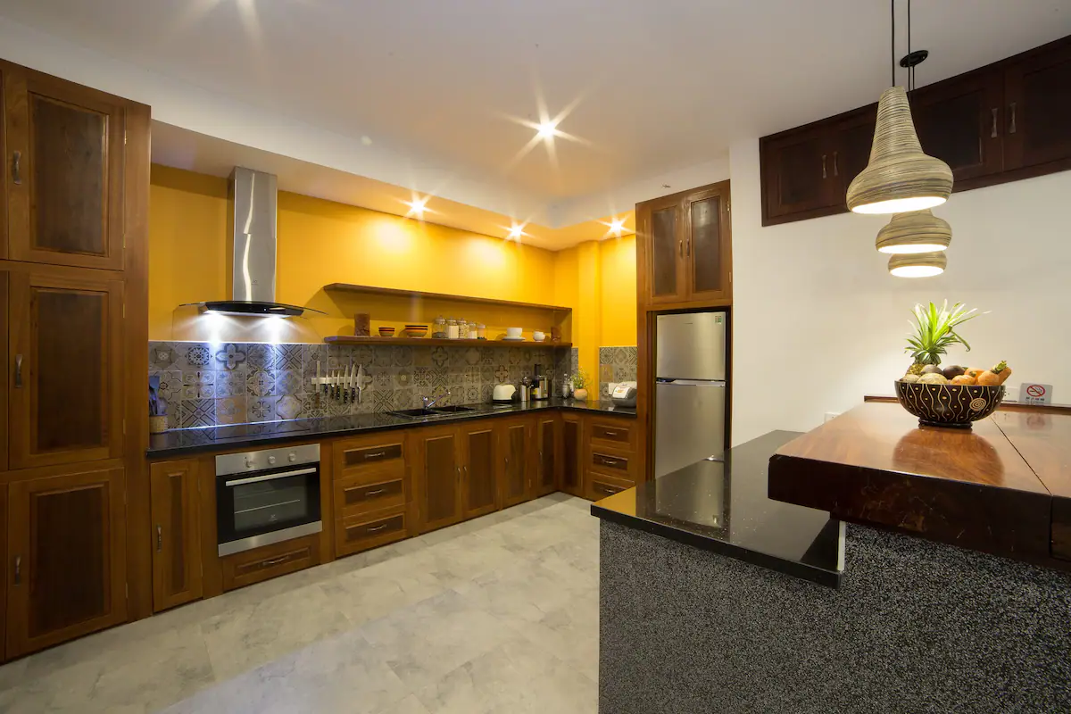 Tranquil Villa Tra Que is a serene retreat nestled in the quiet surroundings of Tra Que Vegetable and Herb Village, just 3 kilometers from Hoi An Old Town and 1 kilometer from An Bang Beach. This spacious villa features 4 large bedrooms, each with its own bathroom, along with 2 kitchens and a refreshing swimming pool in the back garden. From the villa, guests can enjoy picturesque views of the river, garden, and pool.